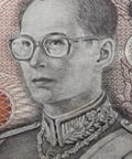 Avers : L'avers présente un portrait du roi Bhumibol Adulyadej (Rama IX) portant un uniforme militaire avec des médailles. Le portrait est entouré de motifs complexes et de dessins floraux. Les armoiries de la Thaïlande sont positionnées dans le coin supérieur gauche. La valeur nominale « 10 » est affichée dans les coins inférieurs gauche et droit. Le numéro de série « 9H 1496955 » apparaît en haut.