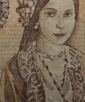 Avers : Portrait d'une femme en tenue traditionnelle chypriote, avec des motifs de dentelle complexes en arrière-plan.
