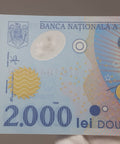 Inscription inversée: 2.000 BANCA NATIONALA A ROMANIEI ARAD TIMISOARA LUGOJ HUNEDOARA PETROSANI TARGU JIU RAMNICU-VALCEA PITESTI DRAGASANI TARGOVISTE PLOIESTI BUCURESTI FALSIFICAREA ACESTOR BILETE SE PEDEPSESTE CONFORM LEGILOR DOUA MII lei 2.000