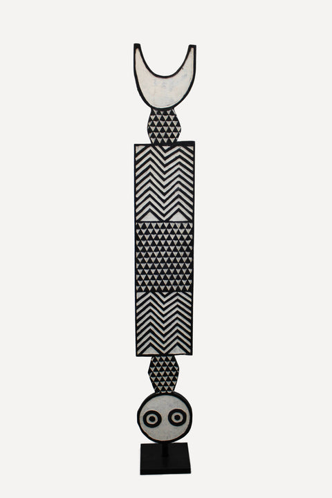 Standing tall as a vertical "plank," this mask is meticulously hand-painted using natural mineral pigments. The design is a symphony of geometric patterns that are as meaningful as they are decorative.
