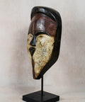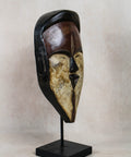 Well known for their reliquary figures the Fang also danced finely sculpted masks during a number of ritual activities. Among the Fang, white-painted masks identified with the Ngil society are known for their elegant abstractions of the human face. Ngil masks have been described as having a 'heart-shaped face' due to the facial features emphasizing refined curves of the orbital ridges above the eyes and the prominent line of the long tapering nose that ended above a discretely mouth carved at the bottom of the chin that completes the abstraction of the face. The Fang people used masks in their secret societies. Members of this male society wore the Ngil masks during the initiation of new members and the persecution of wrongdoers. Masqueraders, clad in raffia costumes and attended by helpers, would materialize in the village after dark, illuminated by flickering torchlight.