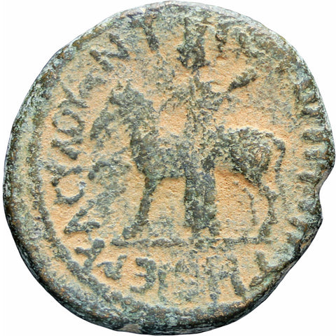 Reverse: Tyche, turreted, standing, head left, holding cornucopiae and bridled horse horse standing left.