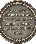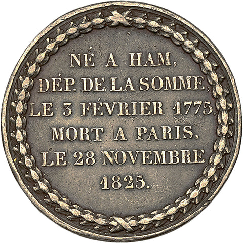 Reverse legend: The inscription reads, "NÉ A HAM, DÉP. DE LA SOMME, LE 3 FÉVRIER 1775. MORT A PARIS, LE 28 NOVEMBRE 1825," indicating he was born in Ham, Somme, on February 3, 1775, and died in Paris on November 28, 1825. This is surrounded by a laurel wreath.