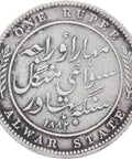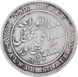 Reverse legend: “ONE RUPEE; ١٨٨٢, ALWAR STATE”