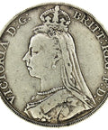 Obverse: Bust of the Queen facing left the small wearing imperial crown, long veil falling behind her head, pearl necklace and earring, Ribbon and Star of the Garter and the badge of the Imperial Order of India; in small raised letters on the bust truncation, the artist's initials J.E.B. (Joseph Edgar Boehm); around, VICTORIA D:G: BRITT: REG: F:D: