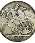 Reverse: St George on horseback advancing to right wearing a helmet and cape and holding a sword; below horse, fallen dragon with lance in its side; below exergue line at right the artist's initials B.P. (Benedetto Pistrucci); in exergue, 1889