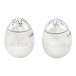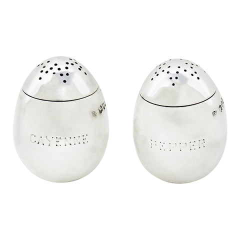 Design: The shakers feature a sleek, egg-shaped design with perforated tops for dispensing pepper and cayenne. Each shaker is clearly engraved with "PEPPER" and "CAYENNE," ensuring their intended use is unmistakable. The simplicity and elegance of the design highlight the exceptional craftsmanship typical of the Victorian period.