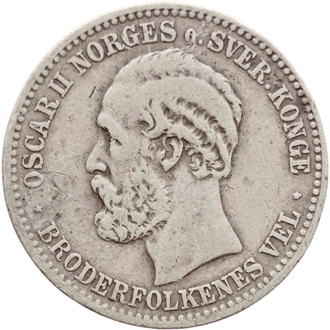 Obverse legend: “OSCAR II NORGES o. SVER. KONGE * BRODERFOLKENES VEL *”