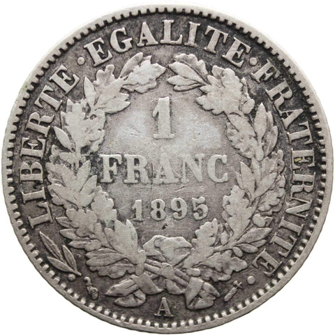 Reverse legend: “LIBERTEEGALITEFRATERNITE 1 FRANC 1895 A”