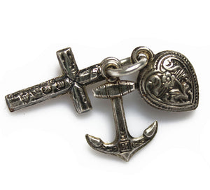 A lovely charm from the Victorian era. This unique silver pendant is comprised of three individual charms, each a symbol with a special meaning. The cross represents faith, the anchor represents hope, and the heart represents charity.