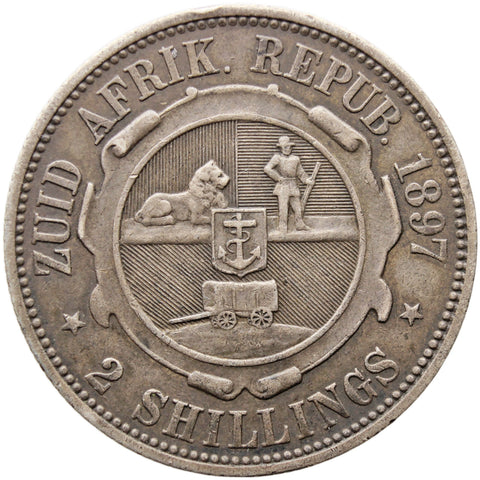 Year: 1897 legend: ZUID AFRIK. REPUB. 1897 2 SHILLINGS