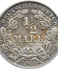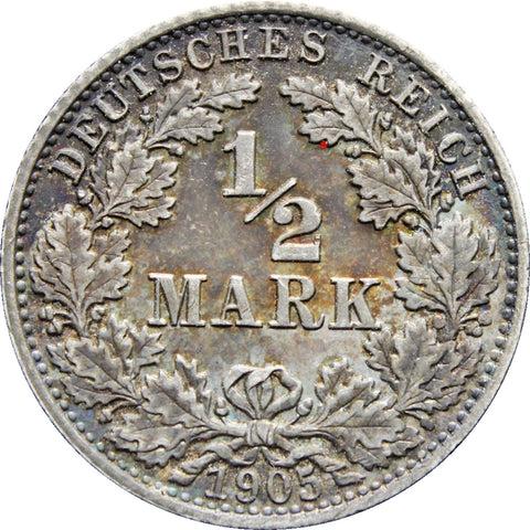 Reverse legend: “DEUTSCHES REICH 1/2 MARK 1905”