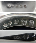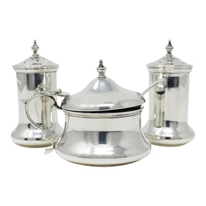 English silver hallmarks for Birmingham 1909, (date letter “k") for Mustard Pot and Pair of Pepper Shakers. Spoon hallmarked 1921 Sheffield, maker Francis Howard Ltd.