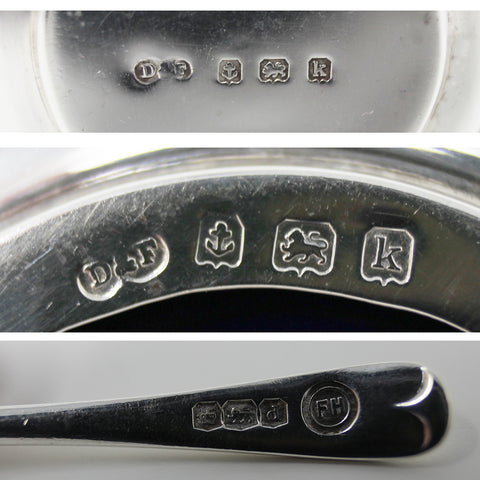 Maker: Silversmiths initials "D&F” Deakin & Francis Ltd for Mustard Pot and Pair of Pepper Shakers. Spoon hallmarked “FH”, maker Francis Howard Ltd.