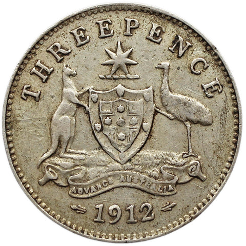Reverse legend: THREEPENCE ADVANCE AUSTRALIA 1912