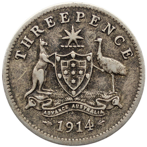 Reverse legend: THREEPENCE ADVANCE AUSTRALIA 1914
