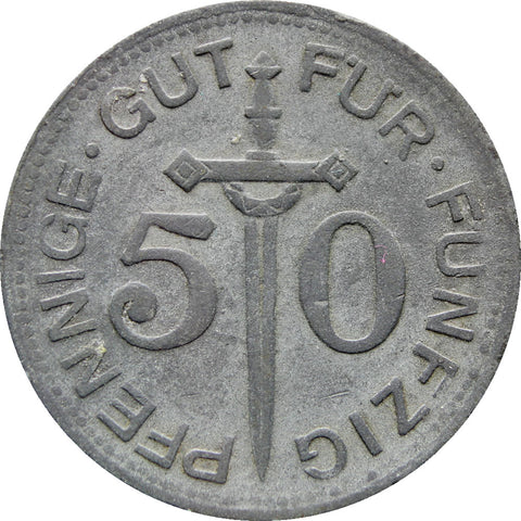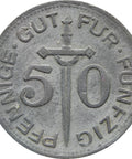 Reverse legend: “GUT FÜR・FÜNFZIG PFENNIGE・”