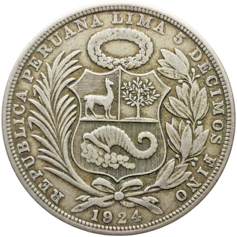 Obverse legend: REPUBLICA PERUANA LIMA 5 DECIMOS FINO 1924
