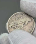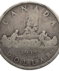 Reverse: A voyageur and an aboriginal travelling by canoe, carrying bundles of which one bears the initials "H.B." for Hudson's Bay Company, are surrounded with the face value and the inscription "CANADA"