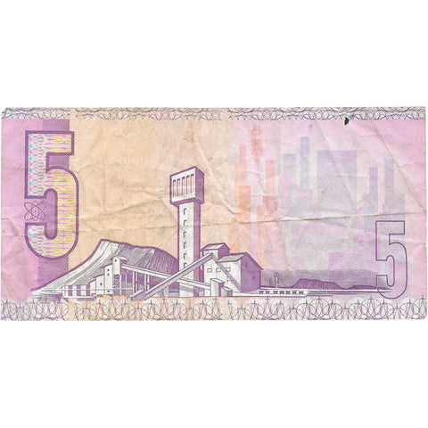 Obverse lettering: 5 SOUTH AFRICAN RESERVE BANK I promise to pay the bearer on demand at Pretoria five rand Ek beloof op aanvraag te betaal aan toonder te Pretoria vyf rand For the south african reserve band Vir die Suid-Afrikaanse Reserwebank PRETORIA / T.W. Dejongh / Governor. President. FIVE / VYF RAND SUID-AFRIKAANSE RESERWEBANK 5