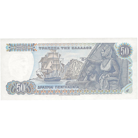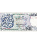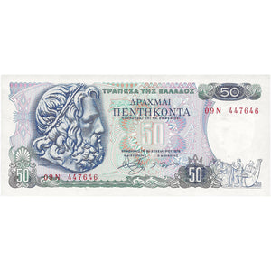 Obverse lettering: ΤΡΑΠΕΖΑ ΤΗΣ ΕΛΛΑΔΟΣ 50 ΔΡΑΧΜΑΙ ΠΕΝΤΗΚΟΝΤΑ ΠΛΗΡΩΤΕΑΙ ΕΠΙ ΤΗ ΕΜΦΑΝΙΣΕΙ ΕΝ ΑΘΗΝΑΙΣ Τῌ 8η ΔΕΚΕΜΒΡΙΟΥ 1978 Ο ΔΙΕΥΘΥΝΤΗΣ Ο ΔΙΟΙΚΗΤΗΣ ΠΟΣΕΙΔΩΝ