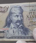 Obverse: Portrait of Theodoros Kolokotronis (1770–1843), the Greek general and hero of the War of Independence, at left. To the right, a depiction of a traditional Greek church. Ornate guilloche patterns frame the denomination “5000.” Lettering: “ΤΡΑΠΕΖΑ ΤΗΣ ΕΛΛΑΔΟΣ” (Bank of Greece) – “ΔΡΑΧΜΕΣ ΠΕΝΤΕ ΧΙΛΙΑΔΕΣ” (5000 Drachmai).