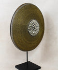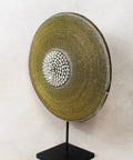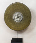 Historically used as a defensive weapon in wartime and displayed as a decorative symbol of status and wealth by the Tikar people in Cameroon. Meticulously crafted, carved from one solid piece of Baobab wood, a sacred wood used for medicinal and ritual purposes for centuries, this large shield boasts hundreds of hand-placed beads on manila string in a circular pattern around a dimensional cluster of natural cowrie shells in the center. These decorative shields are one-of-a-kind, collaboratively crafted by a large group of people to make each piece truly unique and communal.