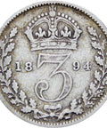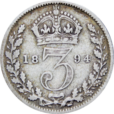 Great Britain Queen Victoria 1894 3 Pence Silver Coin (3rd portrait)