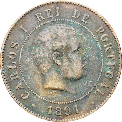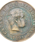 Obverse legend: “CARLOS I REI DE PORTUGAL ALVES • 1891 •”