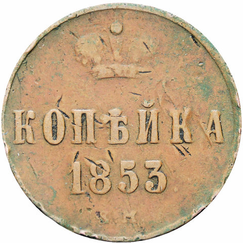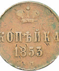 Obverse legend: “КОПѢЙКА 1853 E.M.”