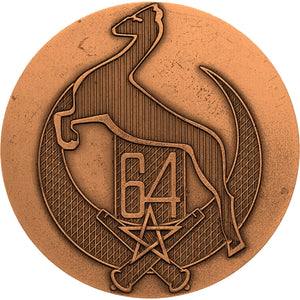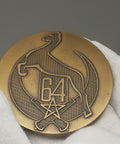 Obverse: The obverse side displays a stylized emblem with a prancing horse, a star, and the number 64. The design elements suggest a military or organizational insignia, with crossed swords and a crescent, possibly indicating an association with a specific regiment or unit.