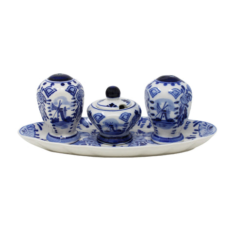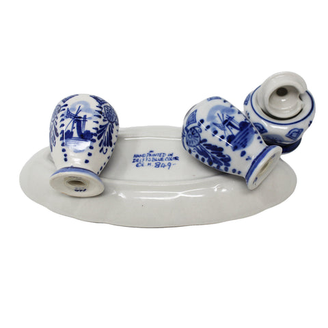 Vintage Hand painted Delft Cruet Set with Tray Blue and White Pottery Mustard Pot and Salt Pepper Shakers